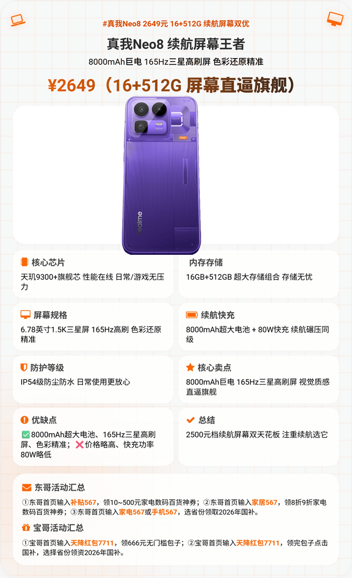 核心亮点是8000mAh超大电池,重度使用能做到两天一充,搭配80W快充约45分钟满电;6.8英寸165Hz三星苍穹屏,M14发光材料,全亮度DC调光,护眼又通透,透明玻璃后盖颜值出众。细微短板:8000mAh电池导致机身稍显厚重,80W快充偏慢。推荐注重屏幕素质、极致续航,喜欢极客玩法的户外工作者、宝妈。